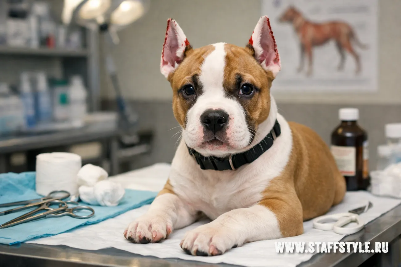 Это решение важнее, чем выбор формы купирования. Отопластика у стаффордширских терьеров требует специфического опыта — понимания породных пропорций, знания особенностей хрящевой ткани, умения работать с лекалами различных форм. Идеальный вариант — хирург, имеющий портфолио работ именно с амстаффами. Не стесняйтесь спрашивать фотографии результатов, читать отзывы, консультироваться у заводчиков. Операция, проведённая на дому, без надлежащего оборудования и стерильных условий — преступная халатность вне зависимости от квалификации врача.